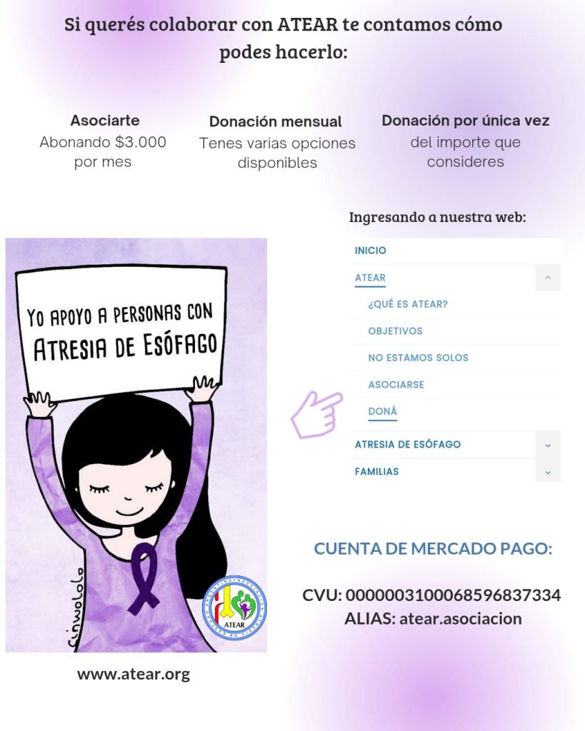 | Queremos que te unas, como socio, a ATEAR porque sabemos que te importa cuidar la calidad de vida de los niños nacidos con Atresia de Esófago tanto como a nosotros. Solo te llevará un minuto y podrás cambiar tu donación o membrecía cuando lo desees. |